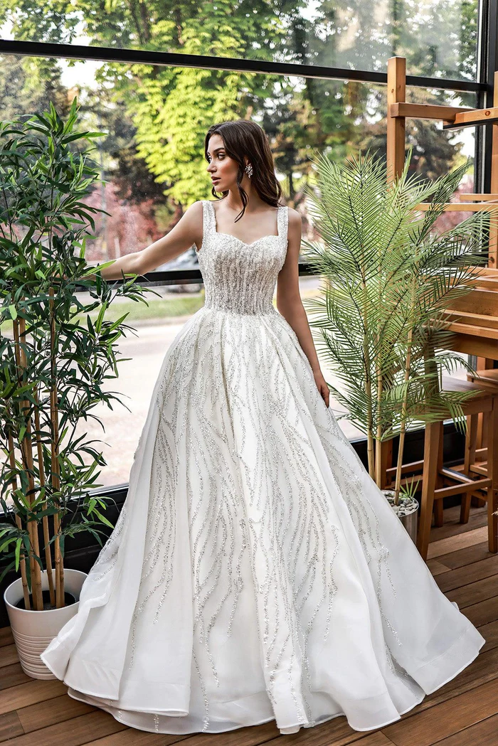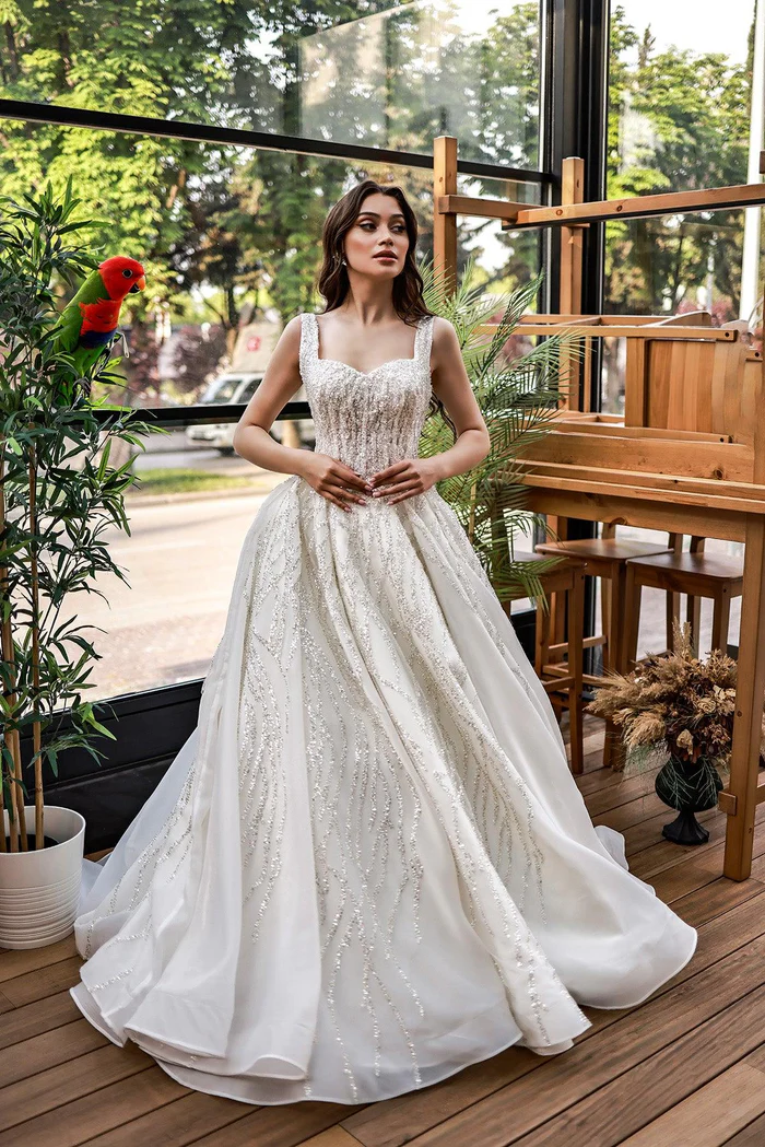 Abito da sposa modello principessa Ball con spalline e lacci! Unendo l'eleganza degli abiti da sposa modello principessa con linee moderne, Ball crea un abito da sposa in cui fluttuerai come una fata nuziale con i lacci sulle spalline. Le spalline decorate con ricami enfatizzano l'eleganza del tuo abito da sposa rivelando le tue spalle con eleganza.